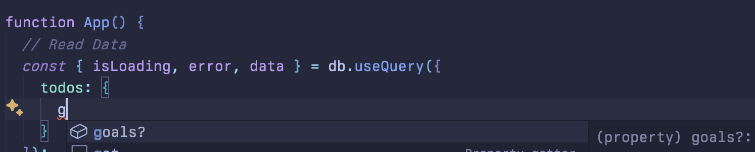 Instant will start giving you intellisense for your queries. For example, if you're querying for goals, you'll see that only todos can be associated: