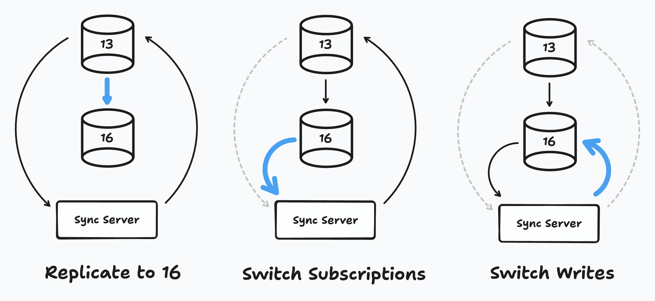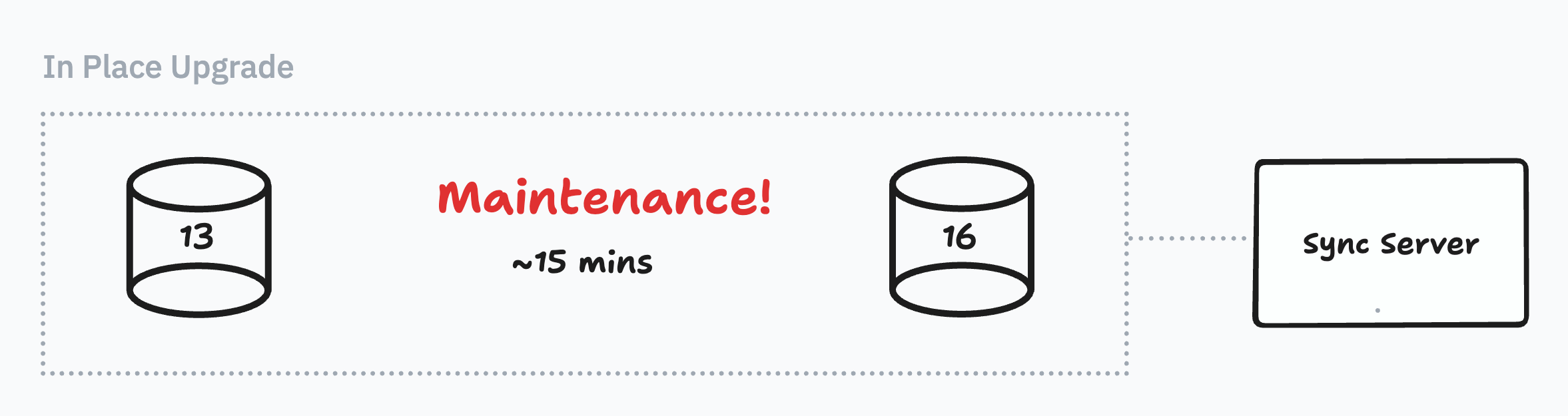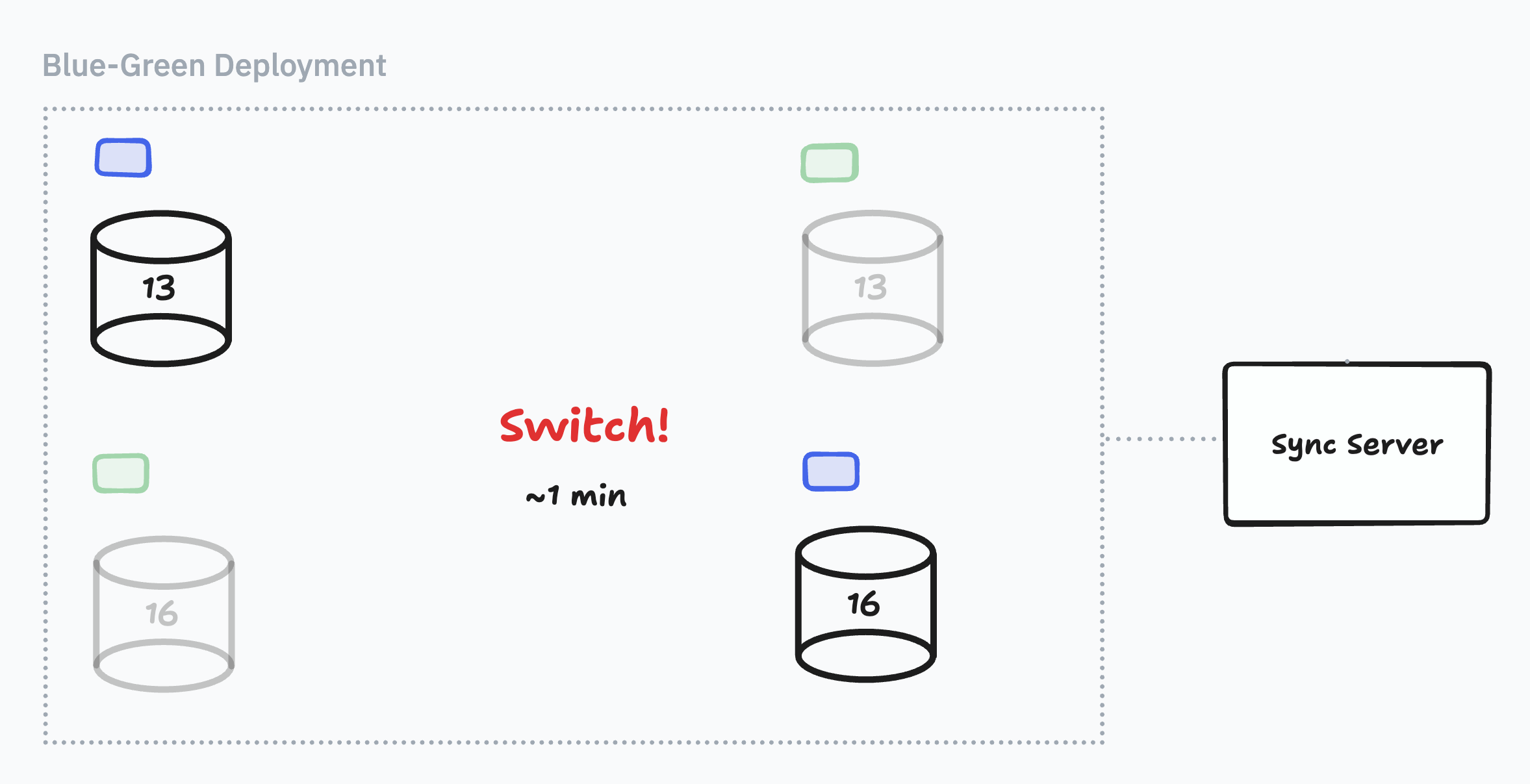 First, we would stand up a new replica running Postgres 16 — Let’s call this machine "16". Once 16 was running, we could get our sync servers to subscribe to 16. The remaining step would be to switch writes "all in one go" (what this meant TBD) to 16. When that was done, migration done.