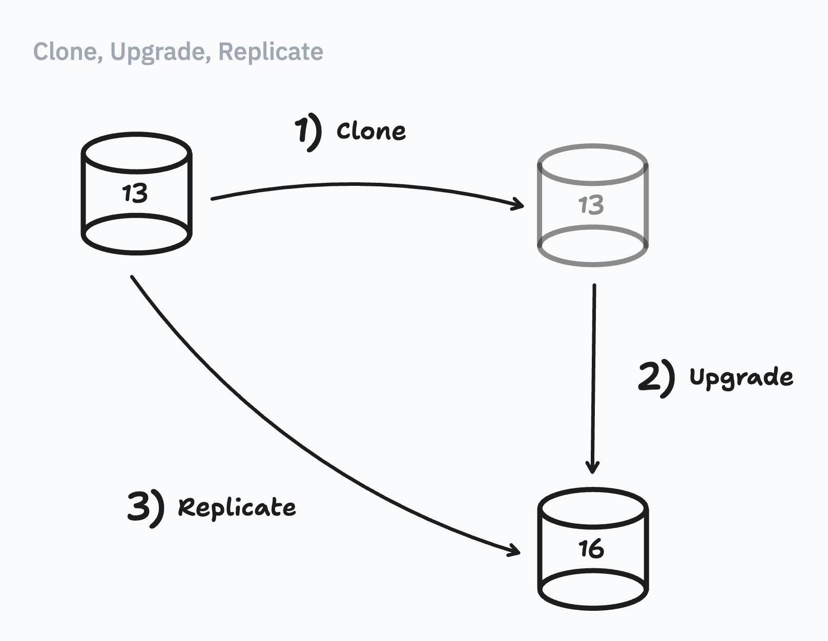 First, we clone our database, then we upgrade our clone, and then we start replication. By the end, our clone would have become a replica running Postgres 16.