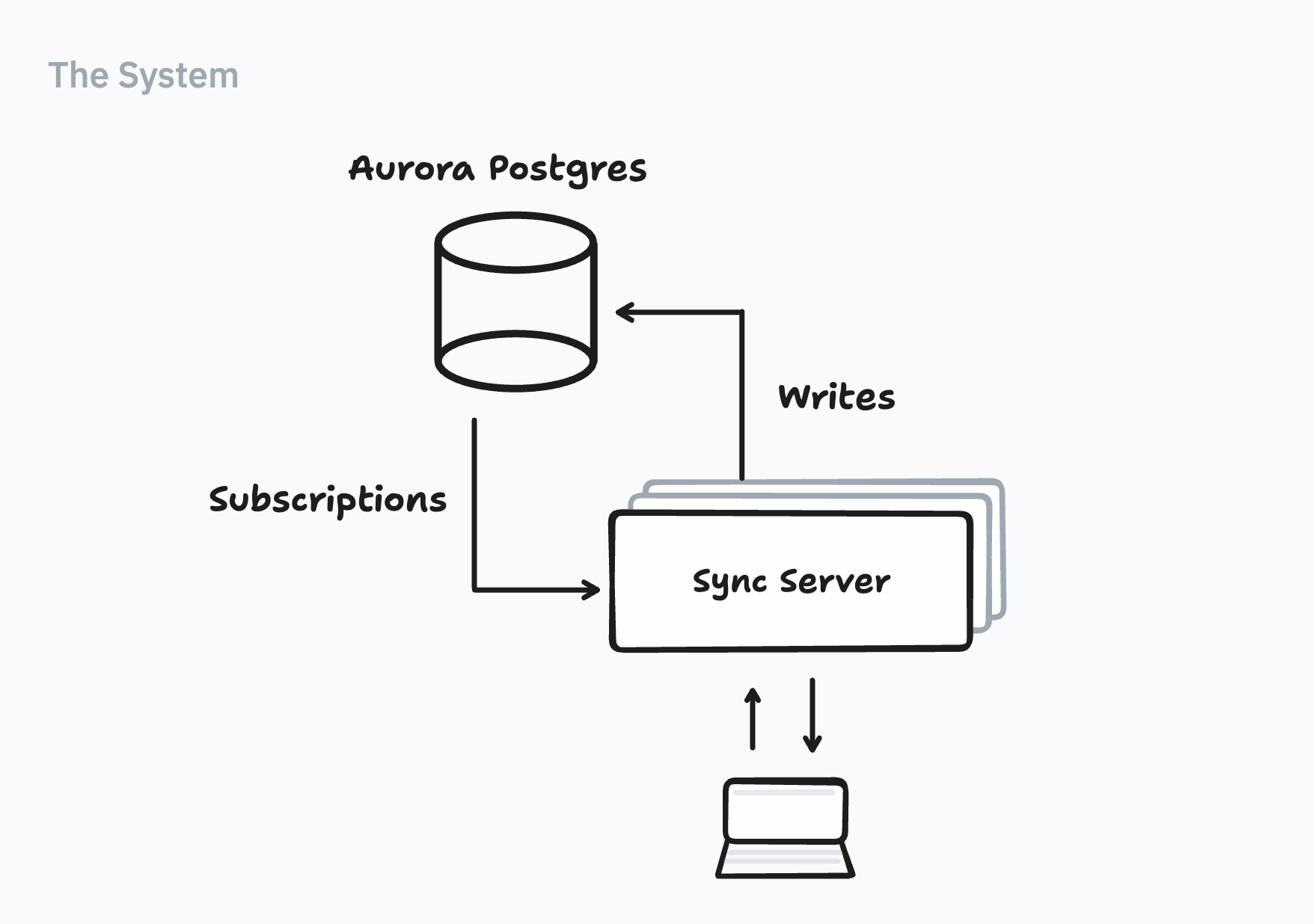 Browsers connect to sync servers. Sync servers keep track of active queries. Sync servers also listen to Postgres’ write-ahead log; they take transactions, find affected queries, and send novelty back to browsers. [1] Crucially, all Instant databases are hosted under one Aurora Postgres instance. [2]